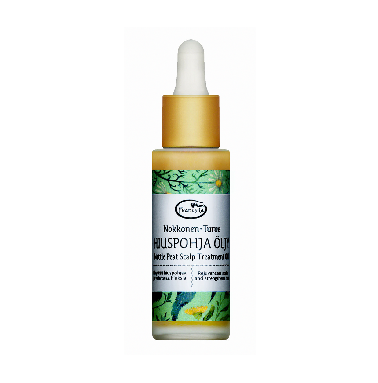 髪と頭皮に輝きを、森の恵みフランシラのピートヘアケアシリーズ。ピート&ネトルエキスなど植物成分 100%のスカルプエッセンス。 シャンプー前に頭皮全体をマッサージすることで毛穴の周りをクレンジング。 頭皮を洗浄し、フケやかゆみを抑え、髪のハリ感をアップさせて毛先までしっとりと天然の香り成分が頭皮特有の臭いをケア。 アウトバスの毛髪ケアにも使えます。 気持ちもリラックスしながら健やかな頭皮でハリとコシのある艶髪へ。 頭皮だけで肩や首筋のマッサージ用にも